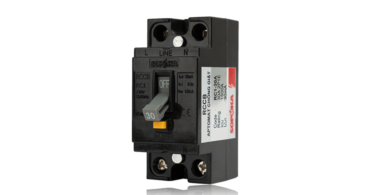 - RCCB (Residual Current Circuit Breaker) – Aptomat chống dòng rò: Có chức năng chống dòng rò (chống giật) và ngắt mạch khi phát hiện sự cố chạm đất. Tuy nhiên, RCCB không có khả năng bảo vệ quá tải và ngắn mạch; nó cần được lắp đặt kèm theo MCB hoặc MCCB.