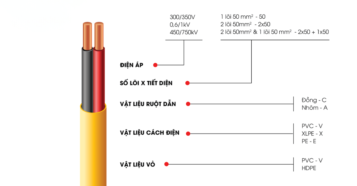 Tên vật liệu lõi và lớp cách điện: Ví dụ: CXV (Cáp, lõi Đồng, cách điện XLPE, vỏ PVC).