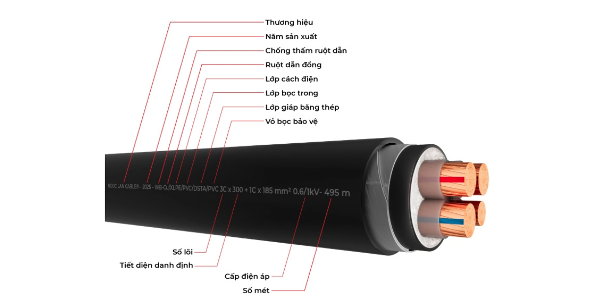 Số lõi x Tiết diện: Đây là phần quan trọng nhất. Ví dụ: 4x16 (cáp có 4 lõi, mỗi lõi có tiết diện 16 mm²). Đối với cáp đa lõi, cần chú ý đến ký hiệu của lõi trung tính, có thể có tiết diện khác.