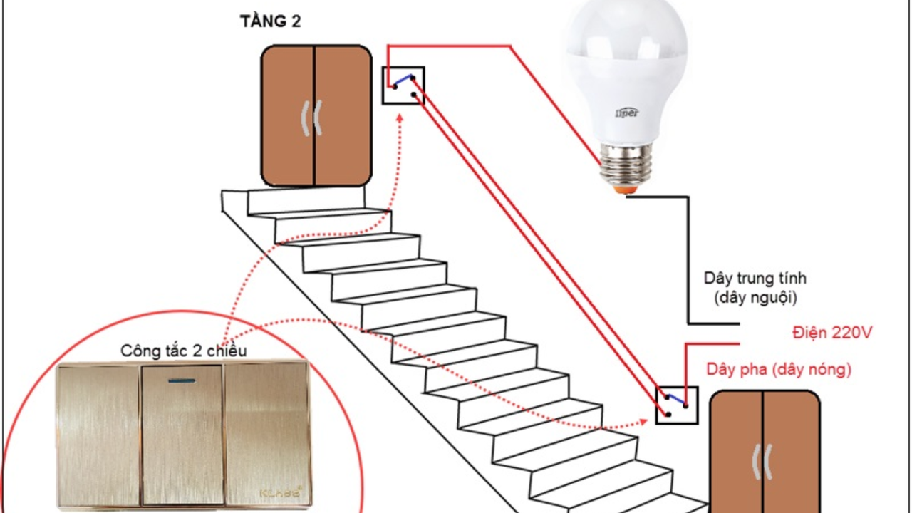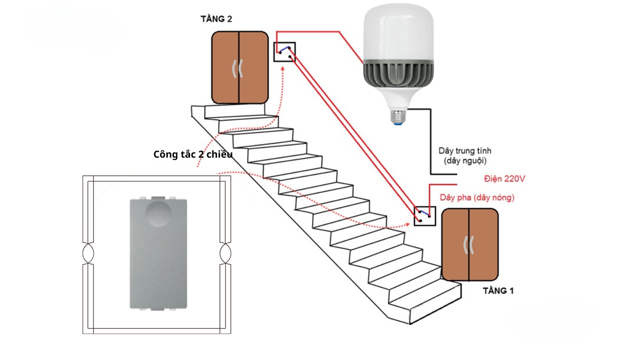 Công tắc điện 2 chiều là thiết bị dùng để điều khiển một bóng đèn hoặc một thiết bị điện duy nhất từ hai vị trí khác nhau. Ví dụ điển hình là công tắc đèn cầu thang, giúp bạn bật/tắt đèn ở cả đầu và cuối cầu thang một cách tiện lợi.
