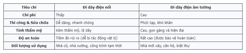 Dưới đây là bảng so sánh tổng quan giữa đi dây điện nổi và dây điện âm tường: