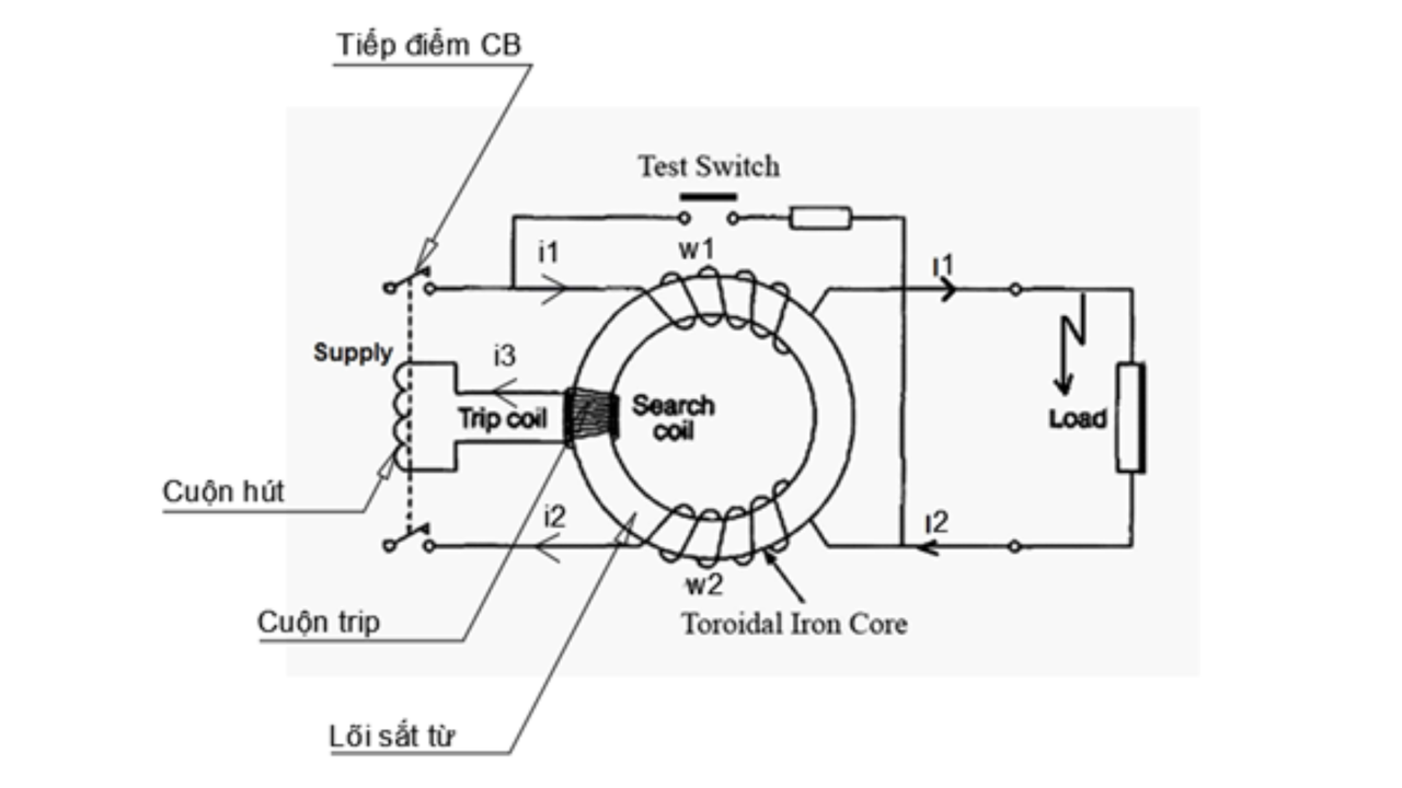 Bộ phận cảm biến dòng rò: Đây là bộ phận quan trọng nhất, thường là một biến dòng hình xuyến có độ nhạy cao để phát hiện sự chênh lệch dòng điện.
