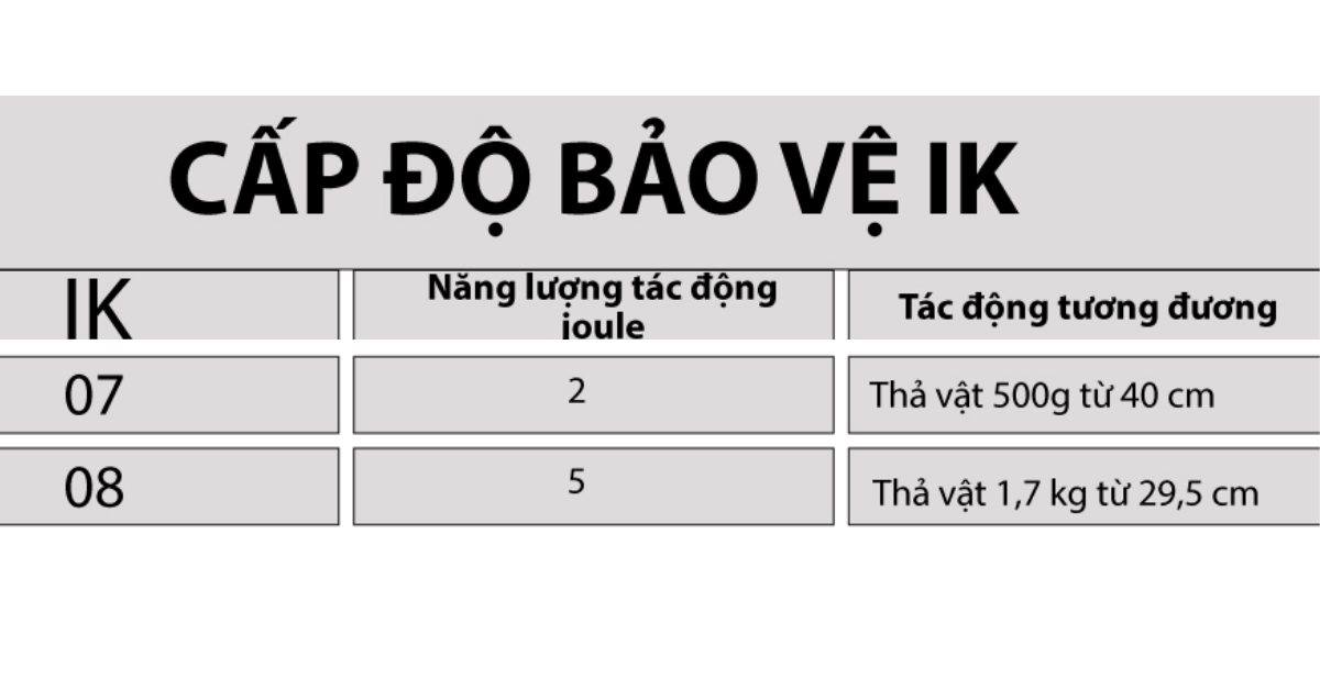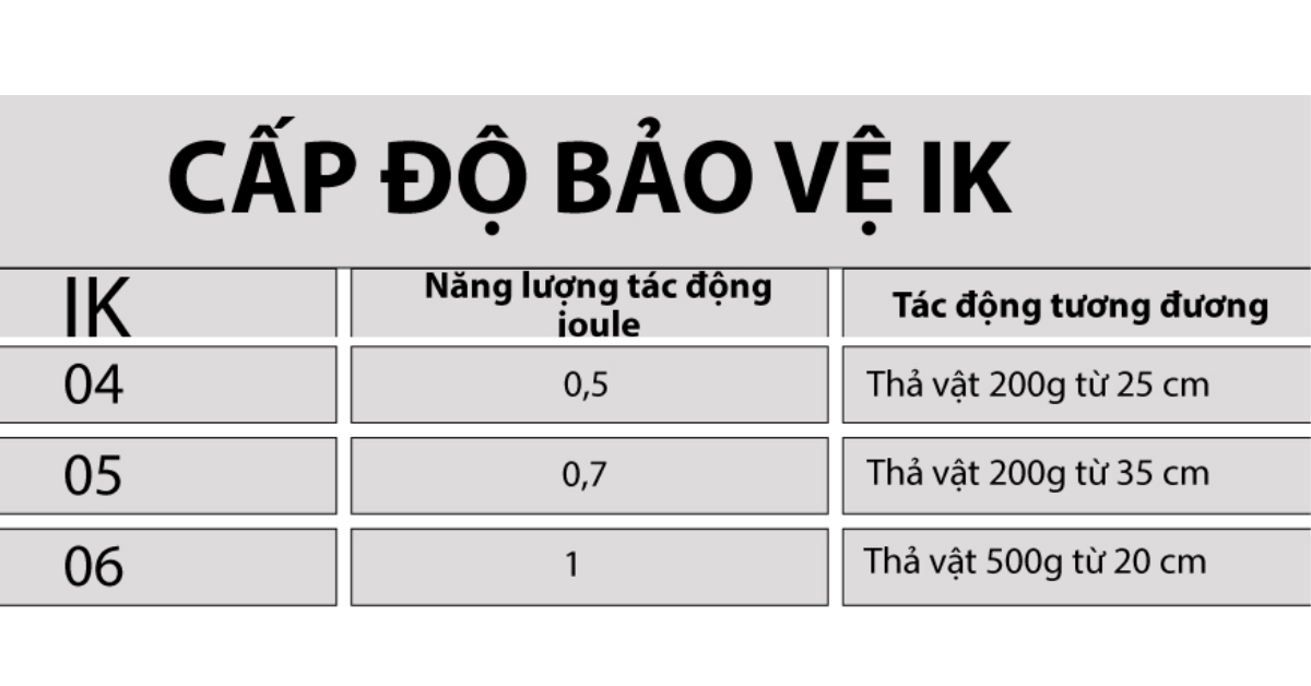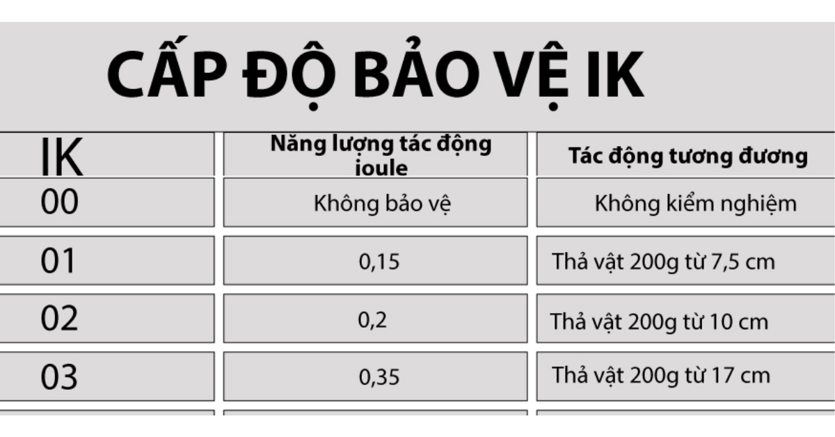 Các chỉ số này bao gồm IK04 (0.5 joule), IK05 (0.7 joule) và IK06 (1 joule). Với IK06, thiết bị có thể chịu được cú va đập tương đương với một vật 0.25 kg rơi từ độ cao 40 cm.
