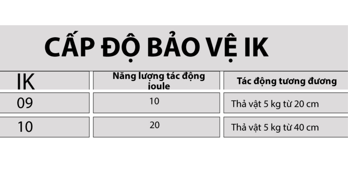 IK09 (10 joule) và IK10 (20 joule) là hai chỉ số chống va đập mạnh nhất. IK10 là chỉ số cao nhất, tương đương với việc một vật 5 kg rơi từ độ cao 40 cm.
