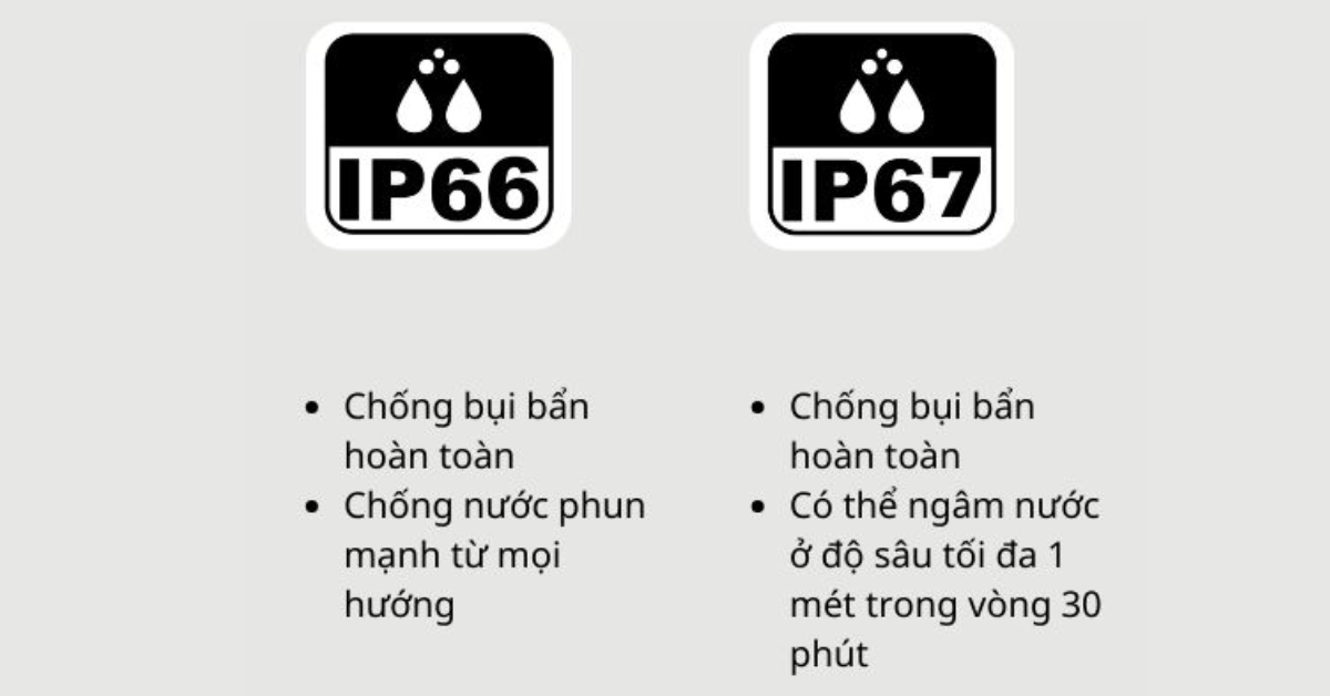 Tương tự, cả IP66 và IP67 đều có khả năng chống bụi hoàn toàn (mức 6). Điểm khác biệt lớn nhất giữa hai chuẩn này là cách chúng bảo vệ thiết bị khỏi nước, một bên là chống phun nước áp lực cao và một bên là chống ngâm nước.